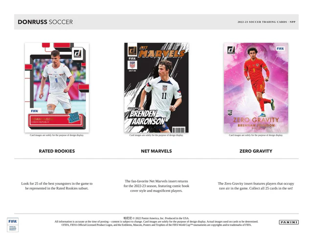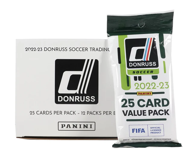 Panini Donruss Soccer 2022/23 to powrót jednej z najbardziej rozpoznawalnych serii kart piłkarskich, prezentującej ponad dwa tuziny najlepszych klubów i reprezentacji narodowych z całego świata. Edycja 2022/23 łączy klasyczny styl Donruss z nowoczesnymi insertami i kartami Optic.